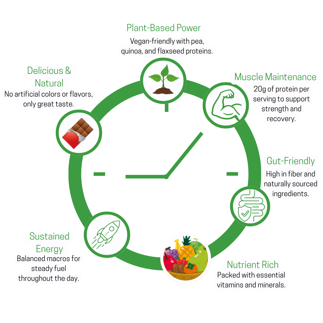 20g of premium plant-based protein, high in fibre, with no artificial colours or flavours. Naturally sourced, vegan-friendly, and delicious.